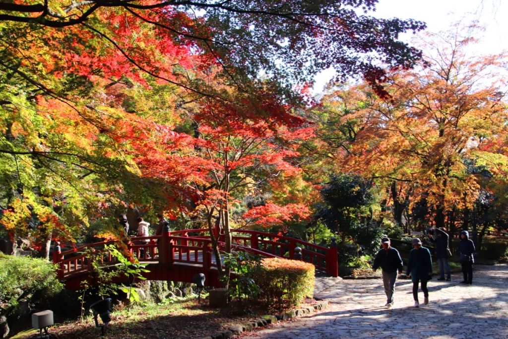 紅葉は今週末にクライマックスを迎え、見ごろはもみじまつり最終日の12月8日まで続くと思います。土日には期間限定のもみじまんじゅうの販売や甘酒無料サービス。日曜には中央広場でジャズコンサートを実施しています。ライトアップは午後4時半から9時までです。