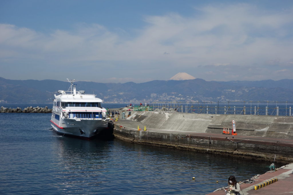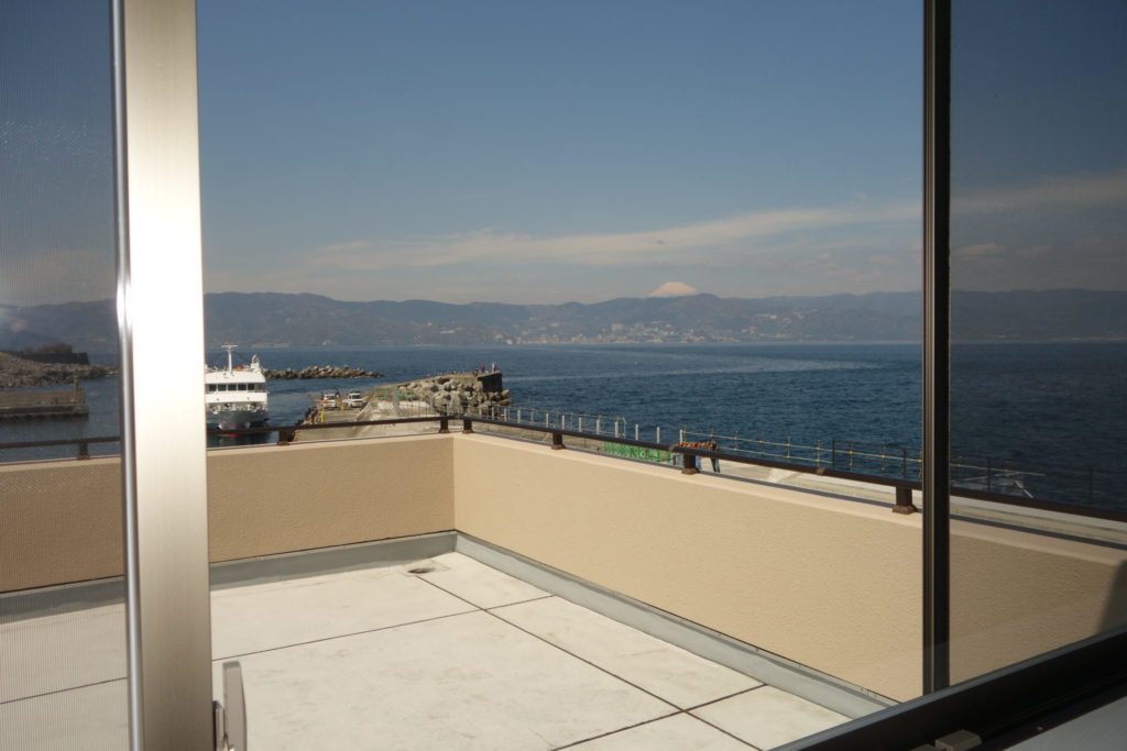 高波などに耐えられるように鉄筋コンクリート造りの交流広場に完成した休憩施設は2階建て。1階部分は定期船の待合所や土産物などの物販コーナー、現金自動預け払い機(ATM)、トイレ、授乳室、管理事務所を配置。2階にも休憩スペースを設け、展望テラスからは富士山や熱海の街並みが望めます。総工費は約3億2600万円。