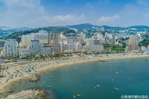 咲くか、咲かないか、その年になってみないと分からない。そんなちょっと気まぐれなジャカランダ。1990年に熱海市の国際姉妹都市、ポルトガルの力スカイス市から贈られた2本が、いまでは100本以上に。常夏の熱帯地域を中心に分布する世界三大花木は、いまでは熱海の初夏を告げる花となりました。熱海の海沿いでは、6月になると、お宮緑地からサンピーチにかけて、ラッパの形をした小さな青紫色のジャカランダの花がブーケのように空を彩ります。