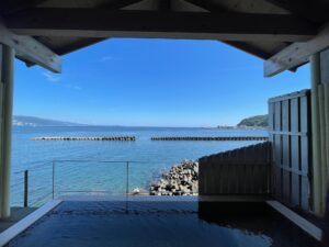 貸切露天風呂横の海岸よりのムーンロードとブルーのライトアップ