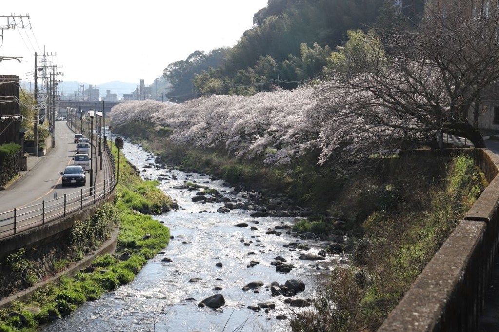 熱海市泉と神奈川県湯河原町の境を流れる千歳川沿いの桜並木で3月25日、桜が満開となりました。例年より1週間ほど早い。桜は千歳川の熱海側(泉大橋下から新幹線ガード間の約200m)にソメイヨシノが40本、大島桜が20本植えられ、市を代表する桜の名所の一つ。花びらがはらはらと舞い、川面が淡いピンク色に染まり始めました。