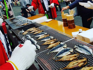 天日干しの脂ののったアジの干物を炭火で焼き来場者に振舞います!(各日2500枚予定)