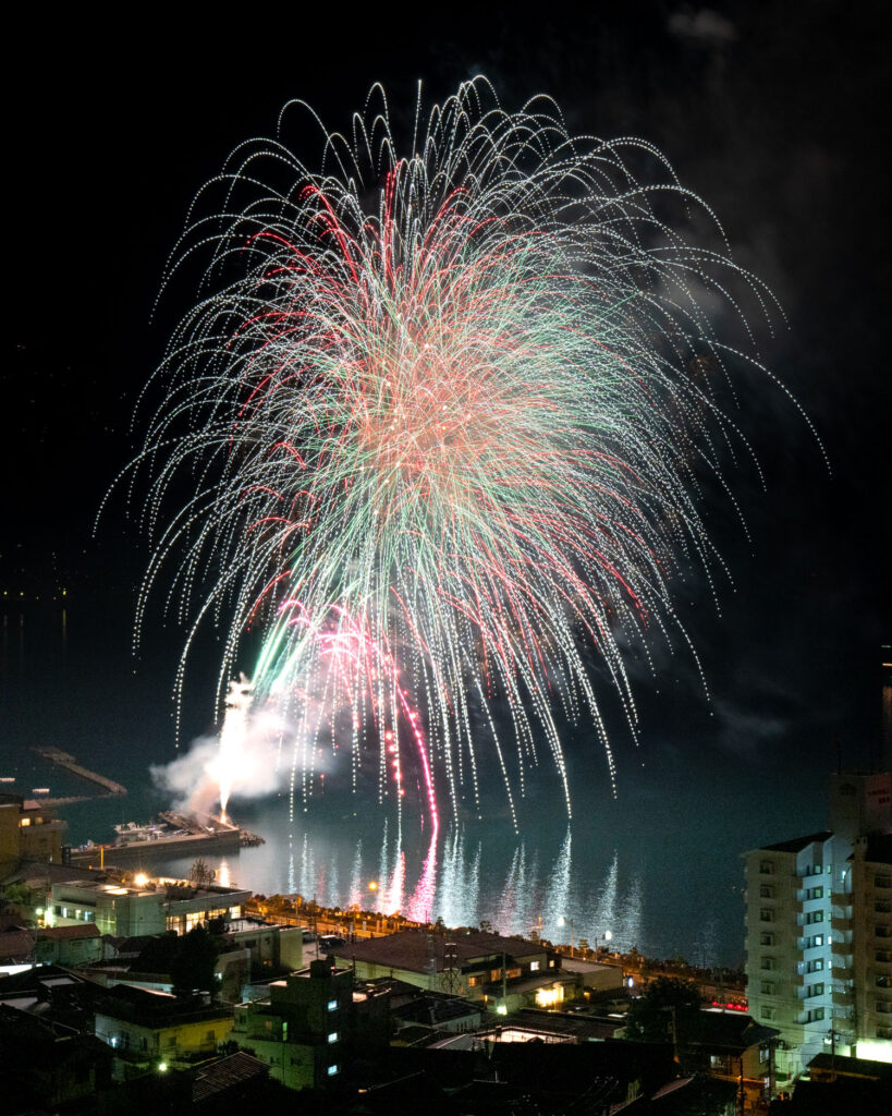 当館の目の前で打ち上げる網代温泉海上花火大会は、海と山との間に挟まれた地形なので、音響効果抜群。特に炸裂した時に魚の形をした花火が人気で、国道135号沿いの網代湾から多賀湾付近で楽しめます。 国道135号線を歩行者天国にして、寝そべっての花火観賞ができる網代温泉の花火大会は感動間違いなしです♪ 打ち上げ3000発 日程2022年8月16日 時間20:30~20:45 会場網代湾 お問い合わせ網代温泉観光協会 雨天決行