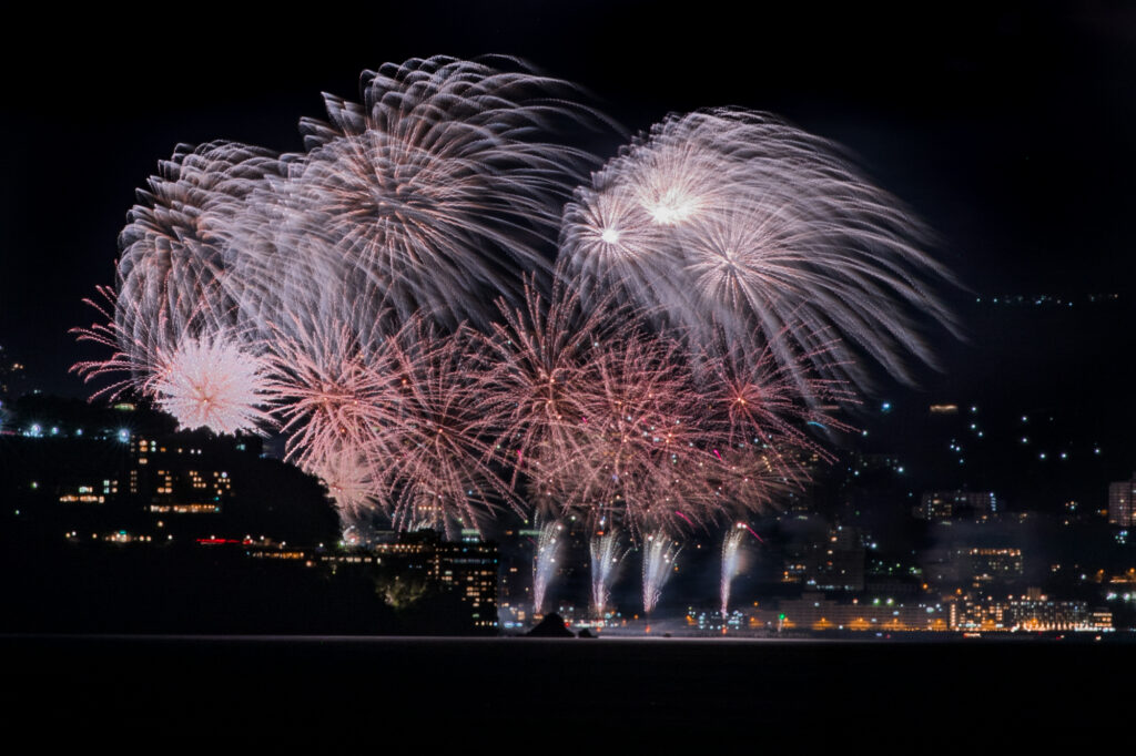 熱海海上花火大会のオープニングは金カムロの一斉打上げからスタート。山に囲まれた熱海湾だからこそ響く反響音に圧巻されます。