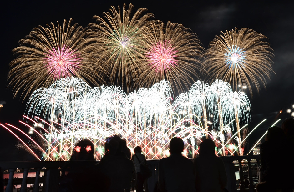 熱海海上花火大会のオープニングは金カムロの一斉打上げからスタート。山に囲まれた熱海湾だからこそ響く、花火の反響音に圧巻されます。