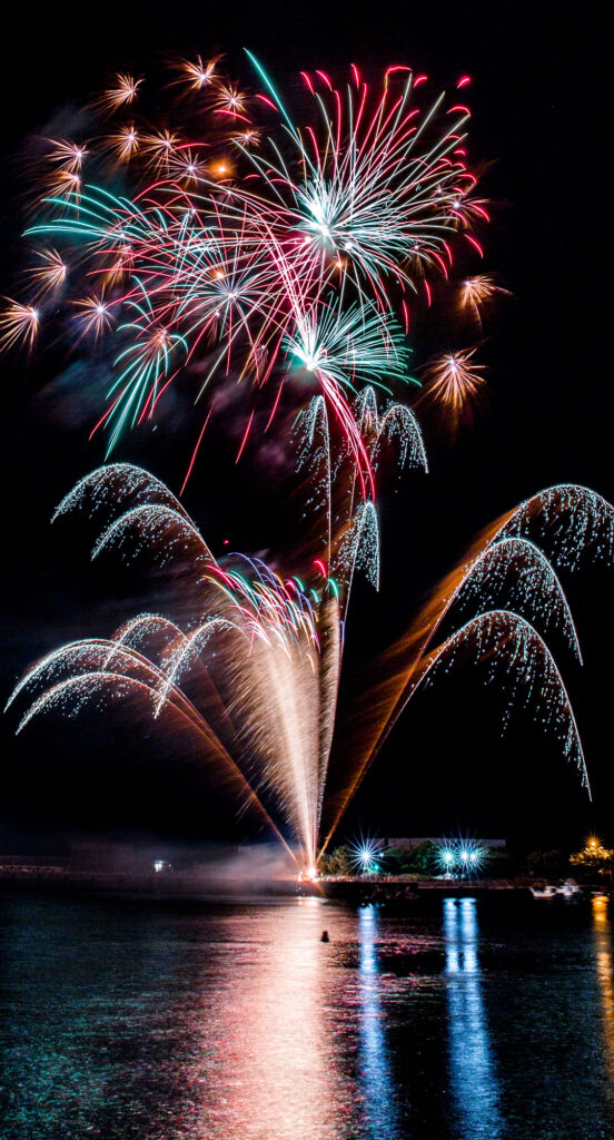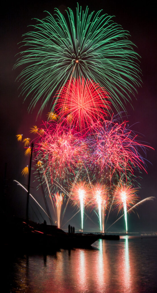 熱海海上花火大会のオープニングは金カムロの一斉打上げからスタート。山に囲まれた熱海湾だからこそ響く、花火の反響音に圧巻されます。