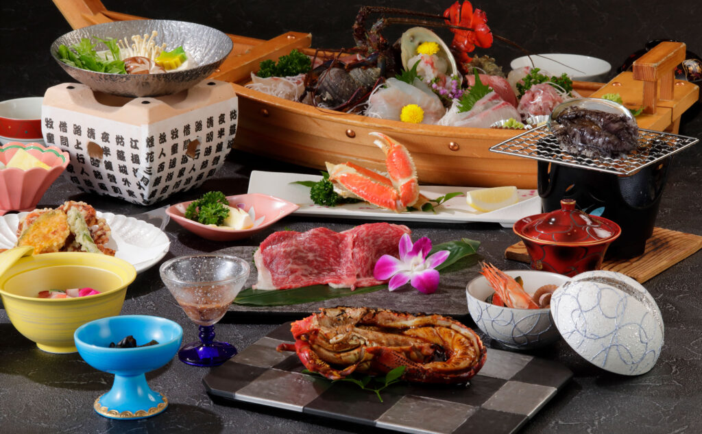 国産最高級のあわびの踊り焼きと伊勢海老の鬼柄焼もしくはカニをお付けする、