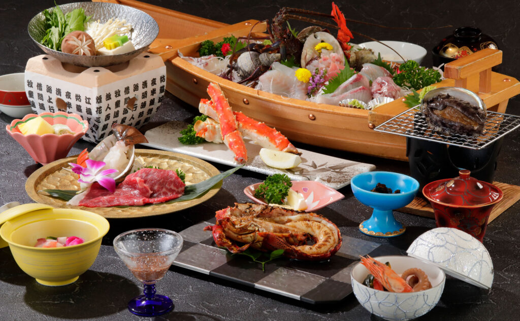 旬の食材や地元の味覚を活かした会席料理が提供され、初日と二日目で内容が異なるよう工夫されています。伊勢海老や鮑など、メイン料理が変わるので連泊でも飽きのこない献立が魅力です。